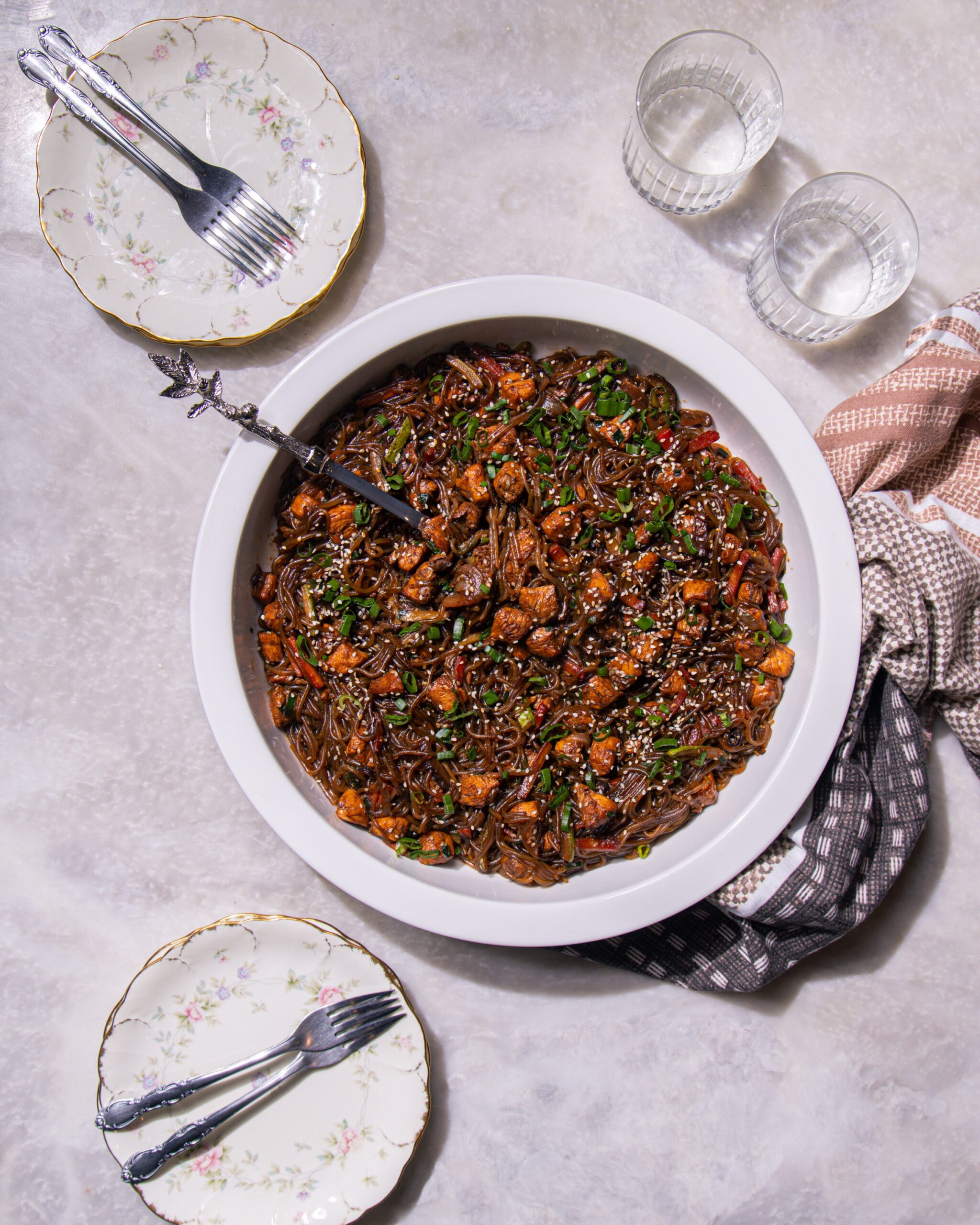 Japchae is one of Korea’s bestselling, naturally gluten-free noodle dishes. It features tender organic chicken and a vibrant medley of vegetables, each cooked separately to enhance their natural flavors, then tossed in a balanced sweet and savory sesame sauce. Finished with toasted sesame seeds and fresh green onions.