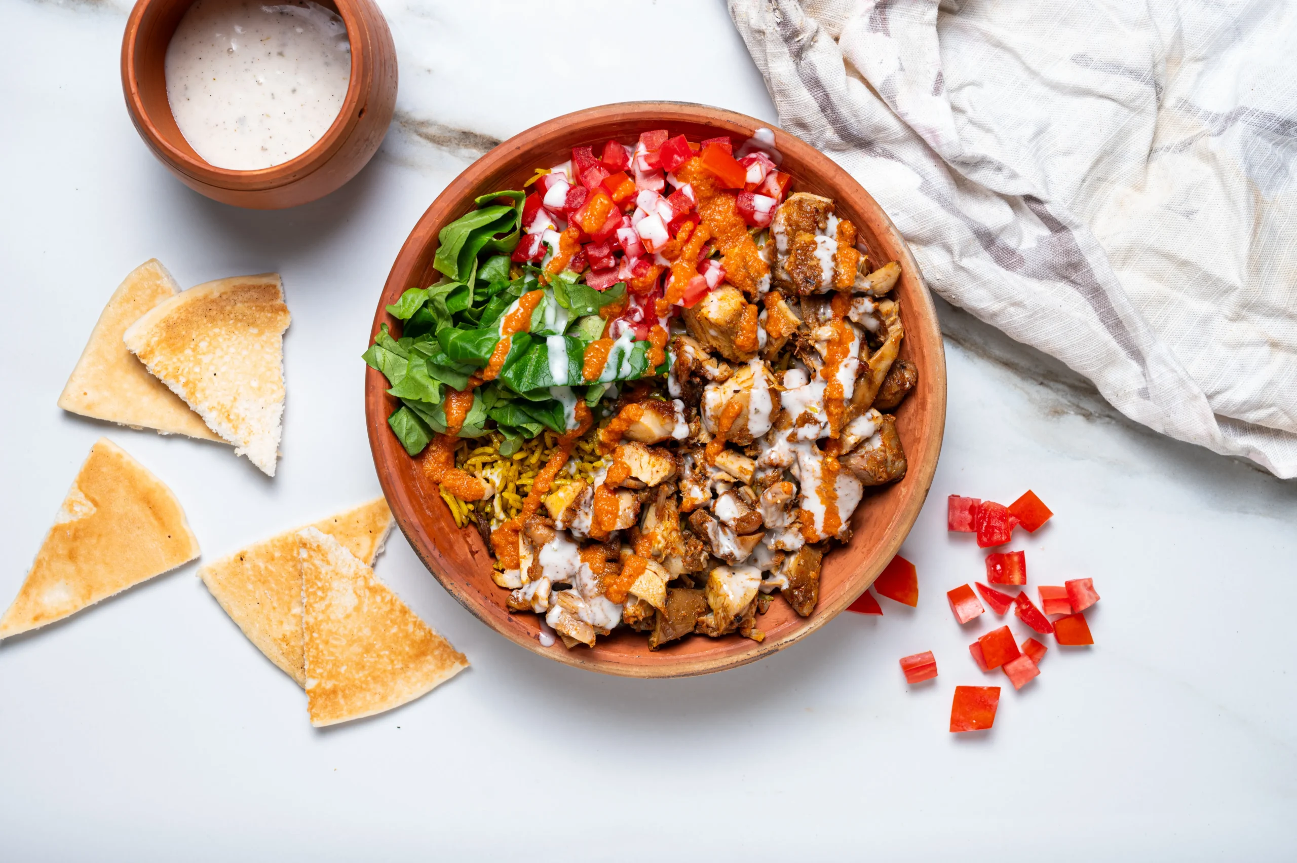 Tender grilled chicken marinated for 24 hours in bold spices, served with fragrant turmeric-toasted rice. Finished with creamy garlic aioli, spicy red sauce, fresh lettuce, ripe tomatoes, and warm toasted pita bread can now be a part of your office events, catering and home spreads!